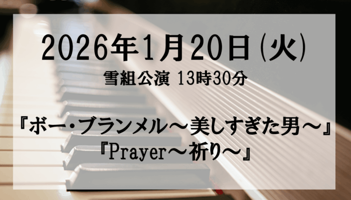 2026年1月20日(火)13時30分 東京宝塚劇場公演のチケットのご案内です。雪組公演ミュージカル・ロマン『ボー・ブランメル~美しすぎた男~』作・演出/生田 大和作曲/フランク・ワイルドホーン プレジャー・ステージ『Prayer~祈り~』作・演出/中村 一徳公式サイト : https://kageki.hankyu.co.jp/revue/2025/beaubrummell/index.html公演日時 : 2026年1月20日(火) 13時30分会場 : 東京宝塚劇場 東京都千代田区有楽町1‐1‐3申込期間 :