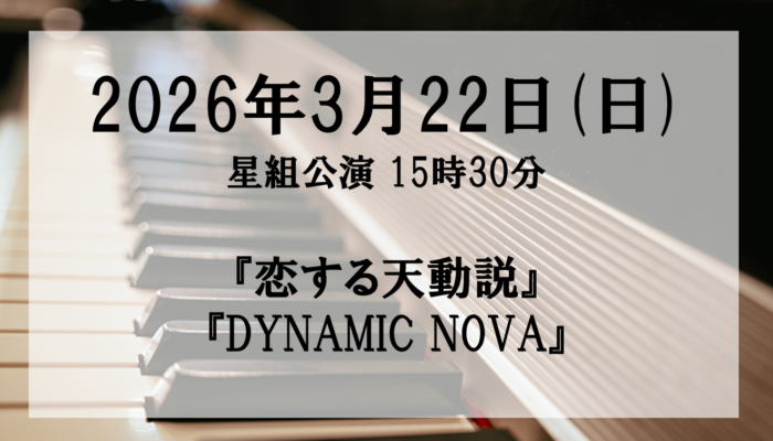 2026年3月22日(日)15時30分 東京宝塚劇場公演のチケットのご案内です。星組公演ビート・シアター『恋する天動説』-The Wand'rin' Stars-作・演出/大野 拓史ギャラクシーレヴュー『DYNAMIC NOVA』作・演出/稲葉 太地公式サイト   : https://kageki.hankyu.co.jp/revue/2026/koisurutendosetsu/index.html公演日時   : 2026年3月22日(日) 15時30分会場     : 東京宝塚劇場 東京都千代田区有楽町1‐1‐3申込期間   :